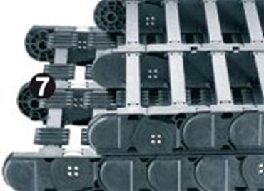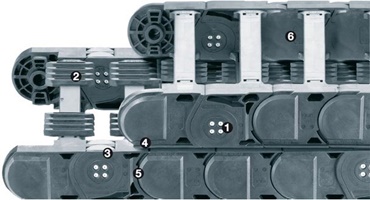 Mit dem wartungsarmen igus® System P4 kann eine sichere Energiezuführung auf langen Wegen bis 800 m für Krananlagen oder Fördersysteme realisiert werden. Das Obertrum und das Untertrum rollen versetzt aufeinander. Dadurch werden die tribooptimierten Kunststoff-Rollen nicht überrollt, sondern rollen auf einer durchgängigen, breiten Rollfläche. Durch die kammartigen AUTO-GLIDE-Stege und das spezielle Rinnensystem wird die P4 e-kette® sicher geführt. Ideal für Anwendungen mit hohen Verfahrgeschwindigkeiten (bis 10 m/s) und großen Füllgewichten (bis 30 kg/m)